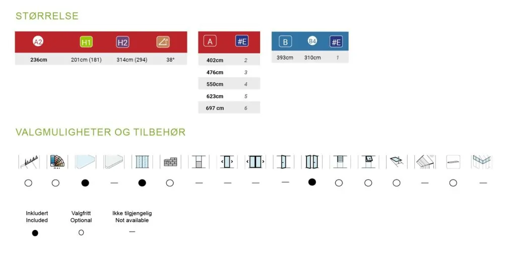 Prisene inkluderer herdet sikkerhetsglass som gir en stor trygghet om uhellet først skulle være ute og noe skulle knuse. Glasset oppfører seg da som glass i biler, det pulveriseres og skal hindre alvorlig skade på mennesker og dyr. Sikkerhetsglasset er 4-5 ganger sterkere enn vanlig glass. Denne modellen kommer i RAL fargene sort (RAL 9005) og hvit (RAL 9010). Stormsikret kvalitetsbygg.