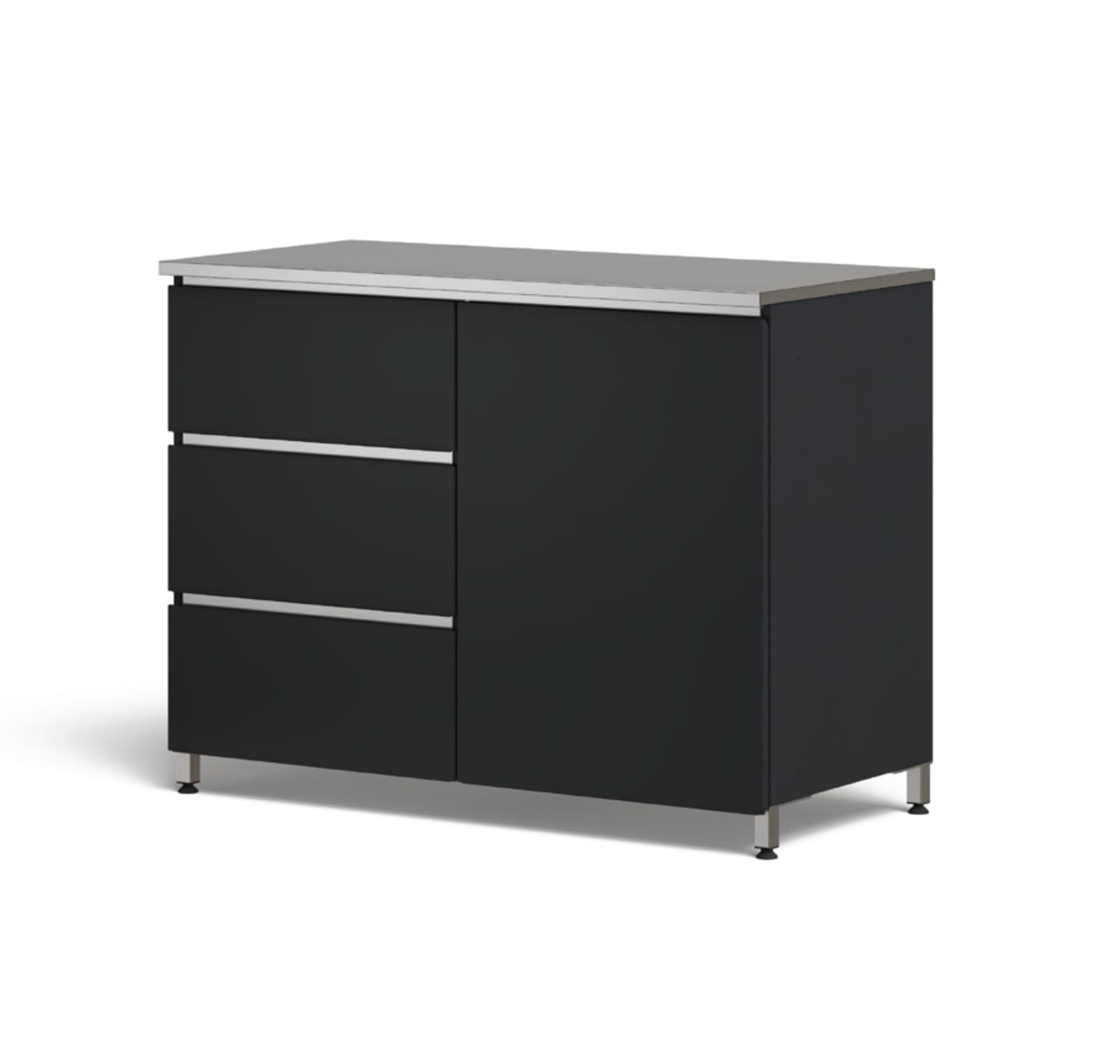 Modul med tre skuffer med glideskinner på venstre side. Hengslet dør, midtvegg og en hylle på høyre side.