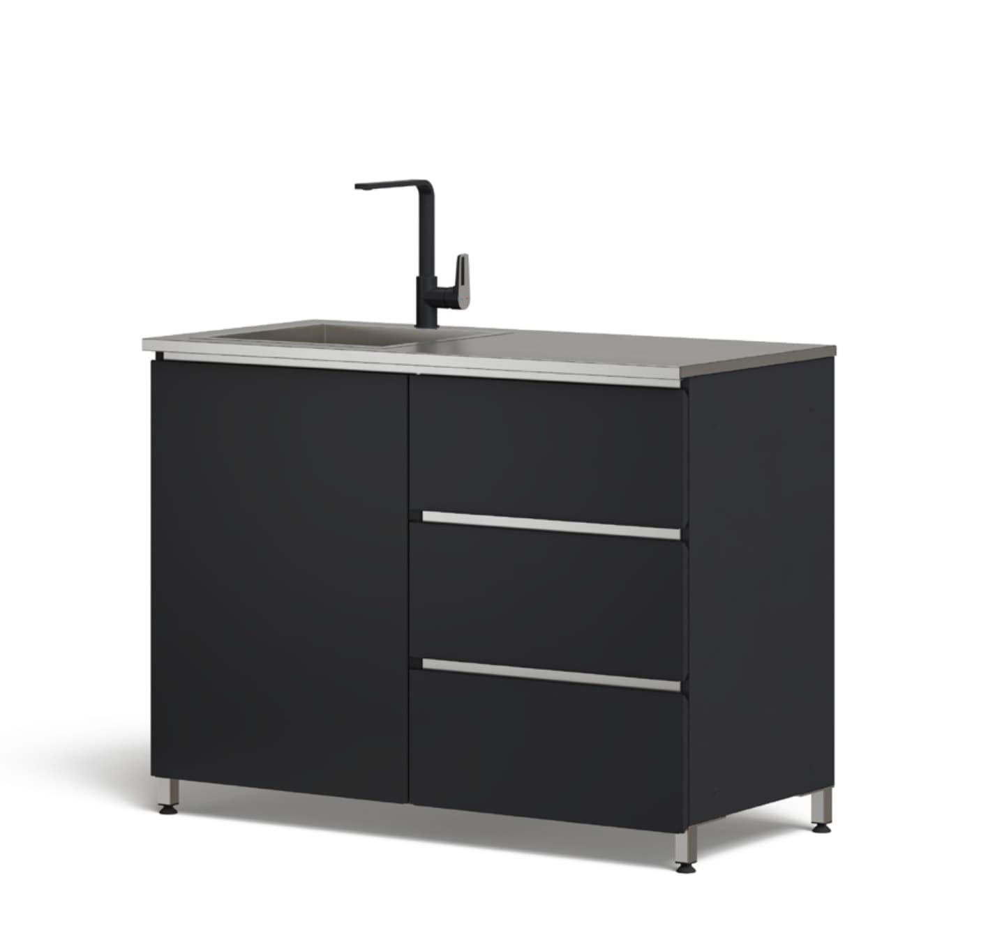 Modul med hengslet dør, midtvegg og en hylle på venstre side. Tre skuffer med glideskinner på høyre side. Kran og firkantet vask på venstre side av benkeplate.